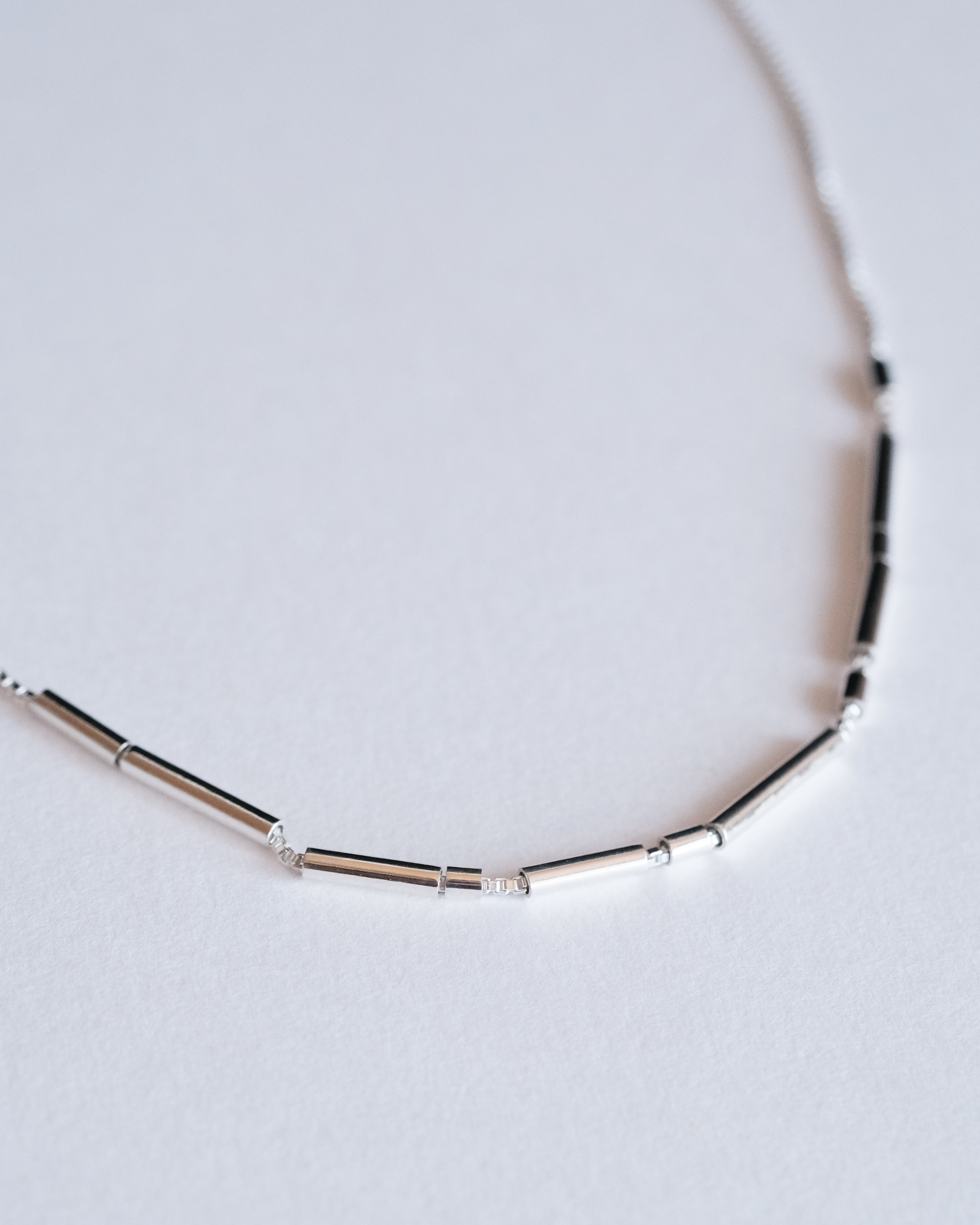 チェーンの長さはチョーカーのように短くし、軽やかに身につけられるように。
