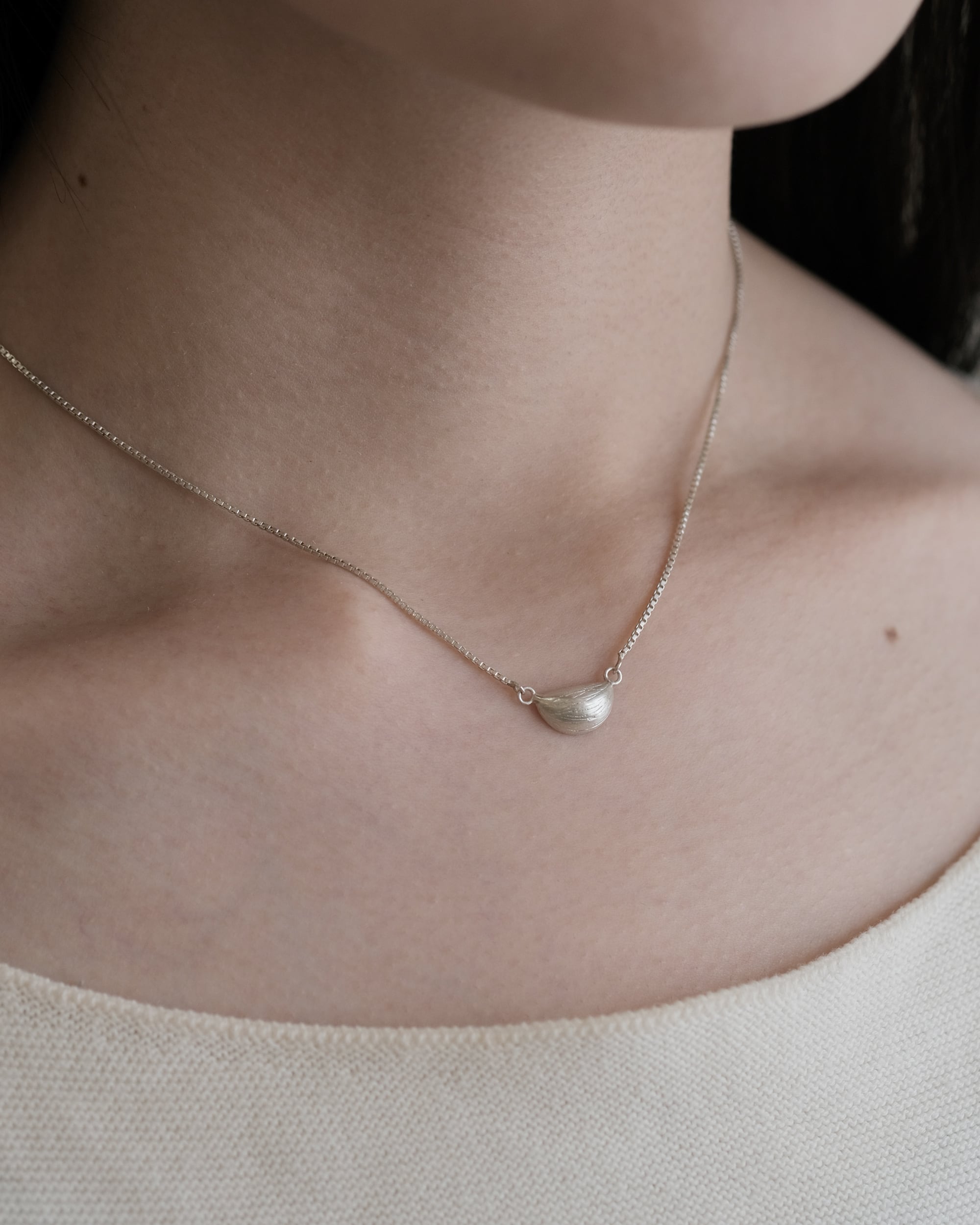 丸みを帯びた形に細かい縦線が刻まれ、上品な印象のネックレス。